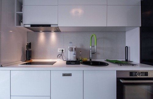 The apartment is luxuriously furnished. High-quality German parquet, a modern built-in kitchen with BOSCH home-connect appliances such as refrigerator, dishwasher, oven with microwave and steam function, ceramic stove and Nespresso coffee machine complete a black and white glossy kitchen. The apartment has a south-facing balcony with sun loungers. The apartment is fully equipped E-Home, all functions can be controlled via Apple Homepods, such. the heating, the air conditioning, the sound system from Apple brings music to every room with Apple music. The bathroom is equipped with a modern shower and high gloss black / white optics. Nuki's electronic door lock facilitates access via the touchpad and the elevator gives direct access to the underground car park. A parking space in the garage is available. The apartment is equipped with electric blinds and air conditioning. The views are breathtaking. You can see the city and the lake thru the window front.
